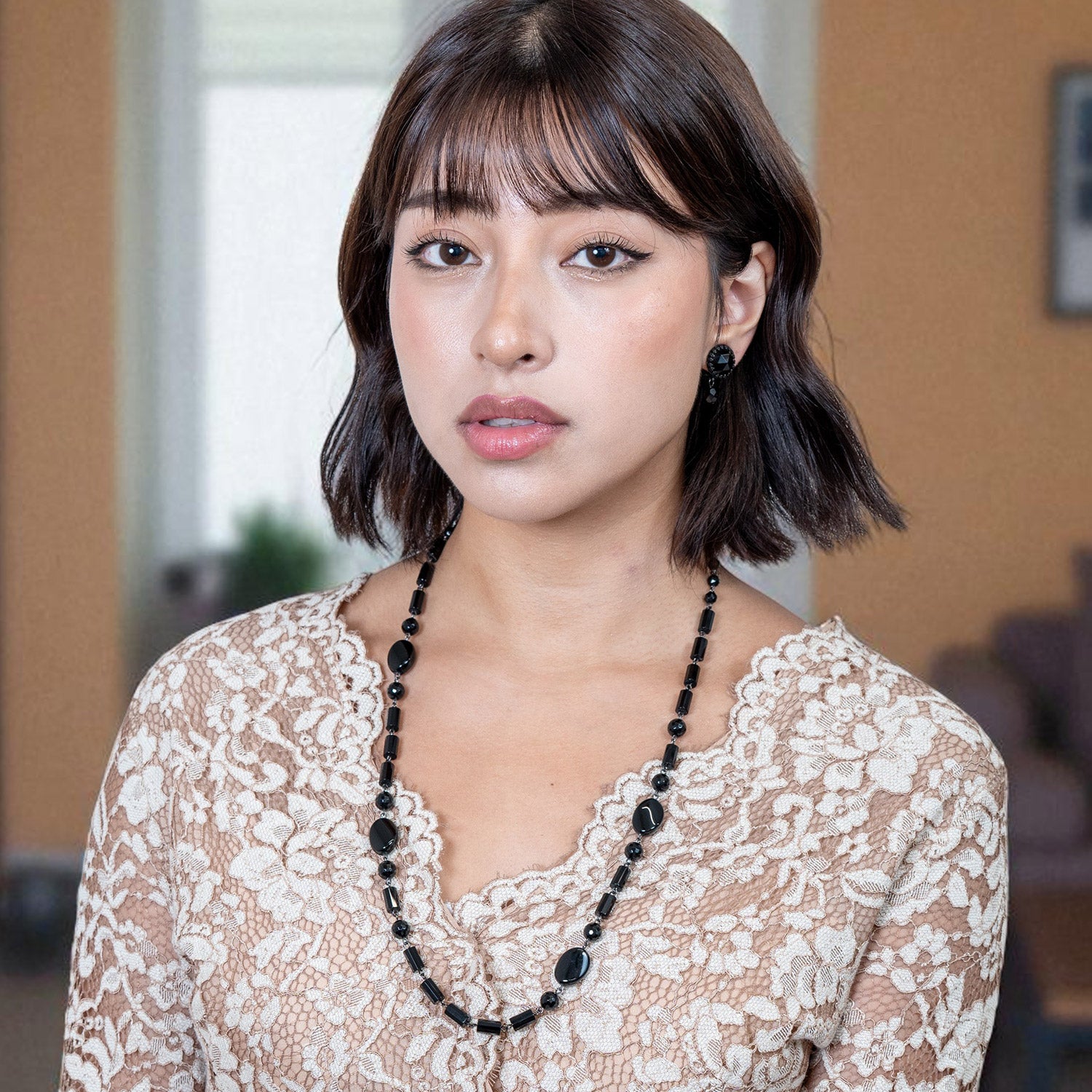 様々なフォルムのブラックアゲートが、デコルテをラグジュアリーに演出します。