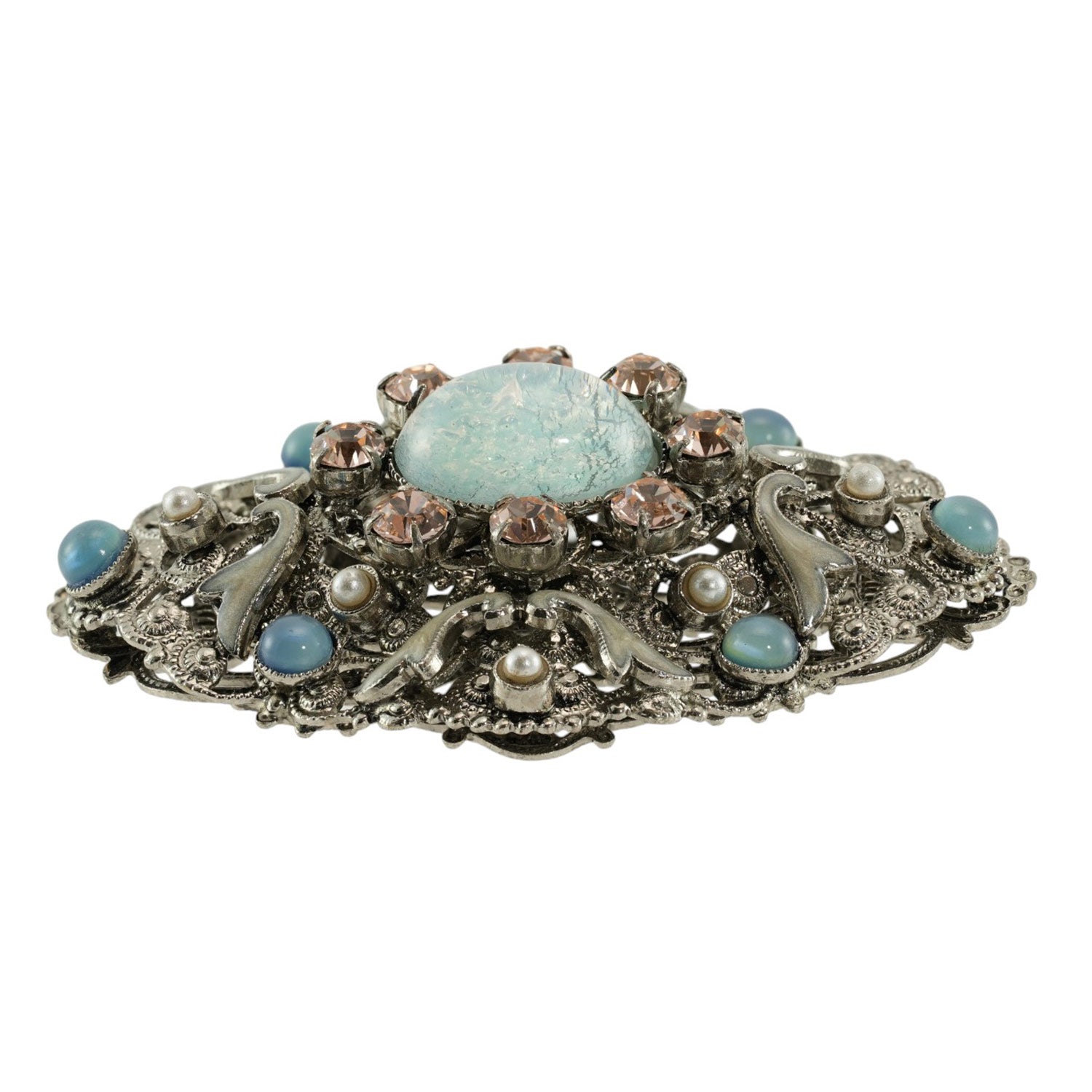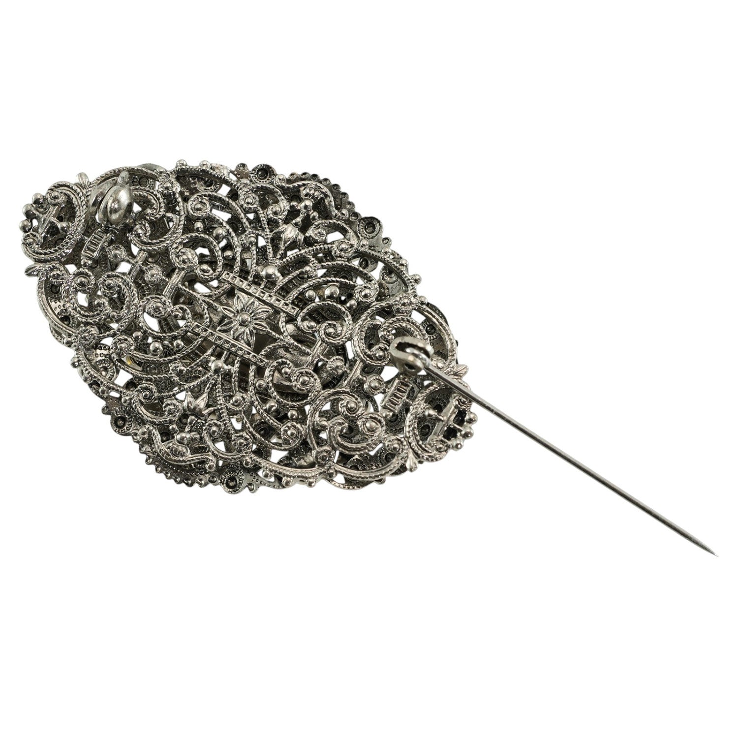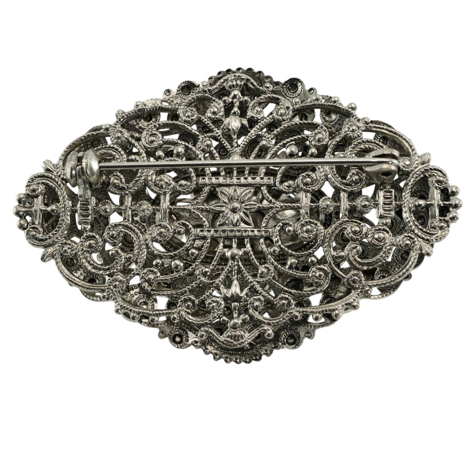 レース模様のようなデザインが美しいビジューブローチ。