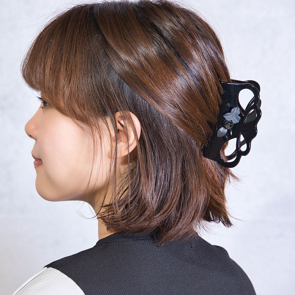 上品な花モチーフが髪に映え、パーティーにもデイリーのおめかしにもふさわしいクオリティです。