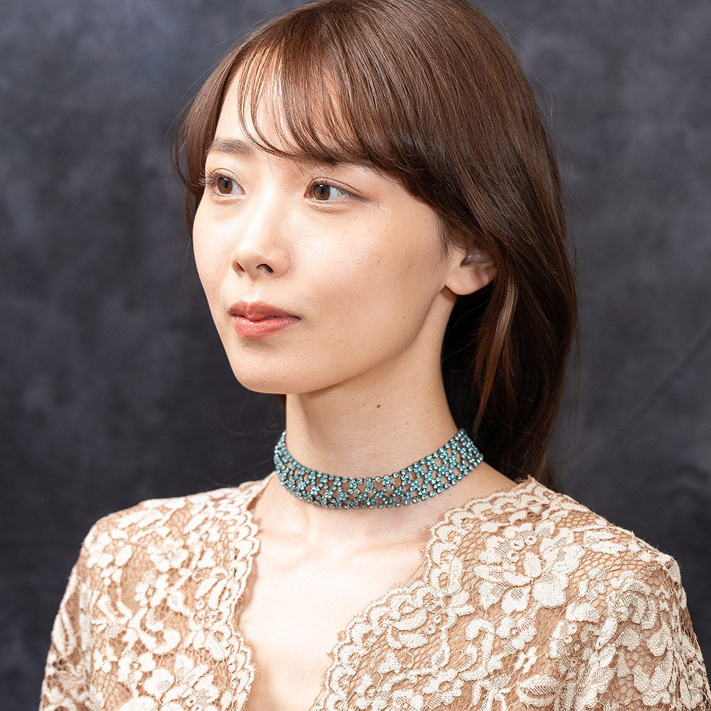 きらめくラインストーンをあしらったチョーカータイプのネックレス。