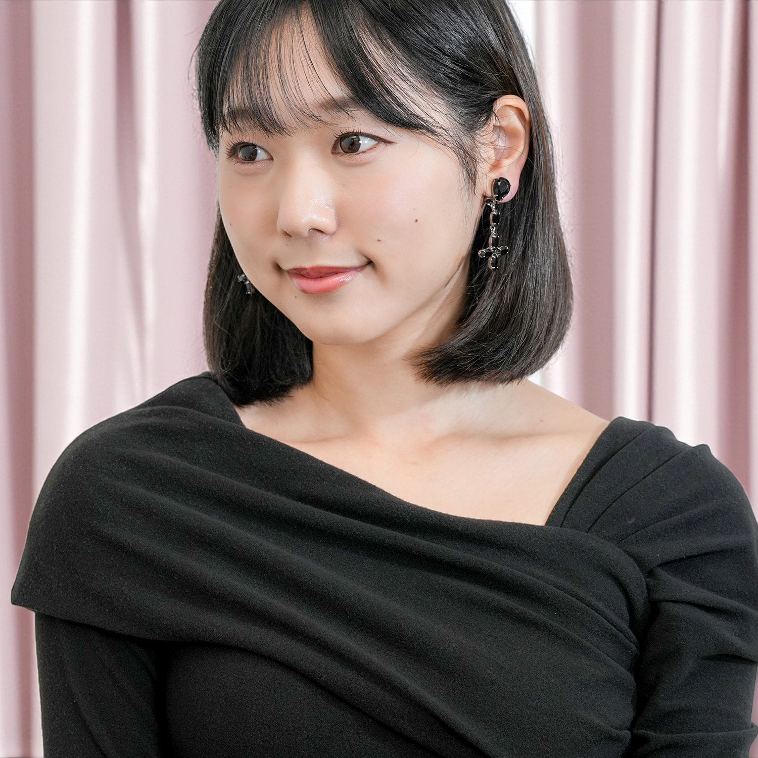 また、ロングイヤリングの細長いフォルムが首元をより細く長く見せ、顔周りを引き締めて小顔効果も期待できます。