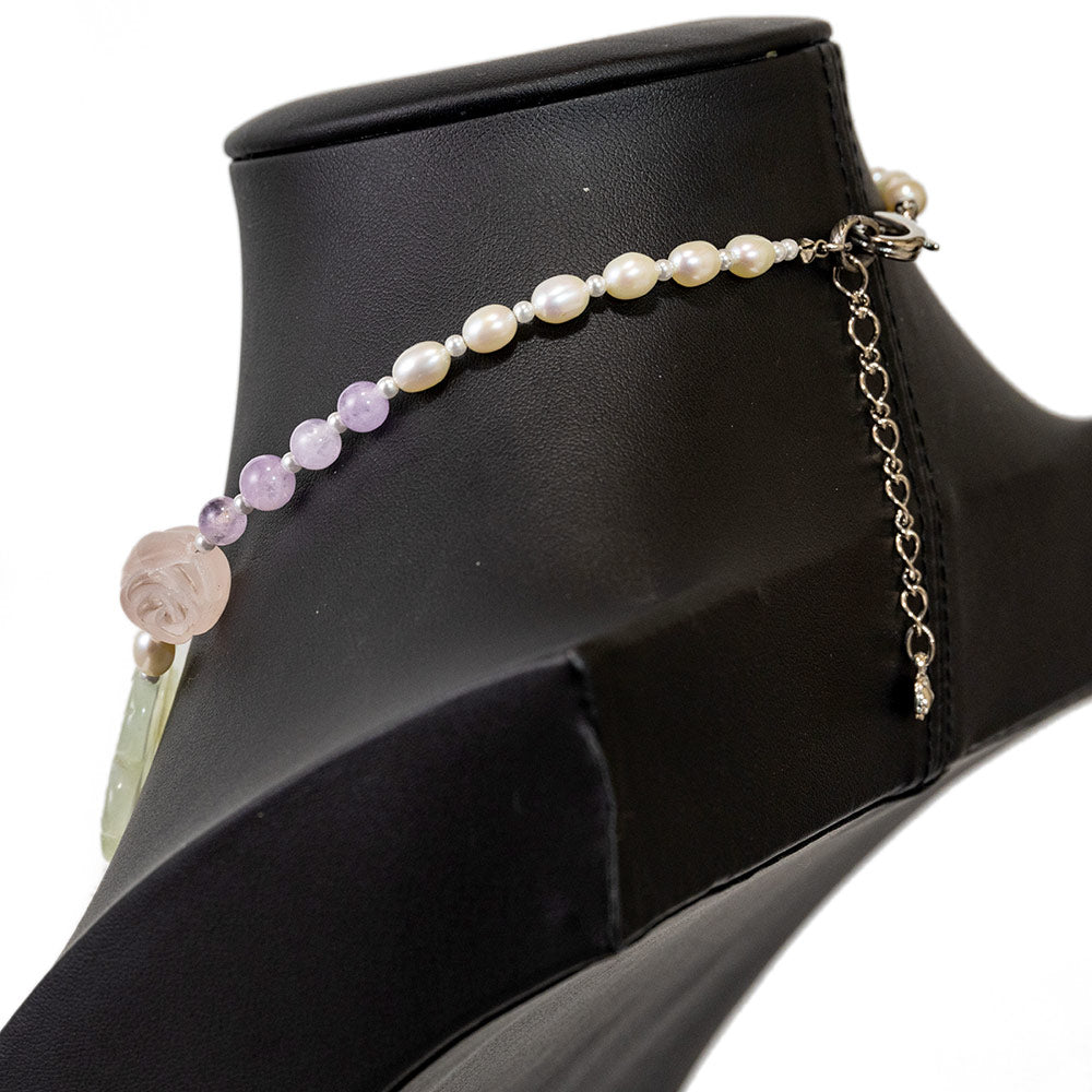 ジェイド、アメシスト、ローズクォーツ、淡水パールを組み合わせたネックレス。